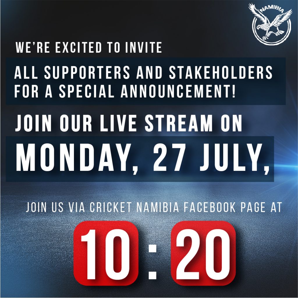 Not to be Missed Eagles Event Cricket Namibia is inviting you to be part of this exciting & memorable event with us on Monday, 27 July at 10:20. Definitely an event you wouldn’t want to miss out on. Click on the link below to watch the live stream on Monday at 10:20.
