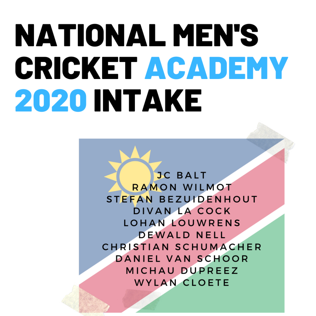 Cricket Namibia is pleased to announce the National Men’s Academy intake for 2020. JC BALT RAMON WILMOT STEFAN BEZUIDENHOUT DIVAN la COCK LOHAN LOURENS DEWALD NELL CHRISTIAN SCHUMACHER DANIEL VAN SCHOOR MICHAU DUPREEZ WYLAN CLOETE